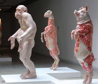 “指鹿为马”完全可以停留在语意层次上,作为一种游戏方式去处理表现,在语言学上就是颠倒能指和所指关系的游戏。就象这些雕塑作品的双面性。比如,向京塑造了女人体,用“你的身体”做题目。显然,不用说,人们都知道这是女人体。但是,正是这个女性的“你”在性别上出现了问题。“你”是一个所指,在向京的作品中于是出现了一个悖论:到底是“属于男性的女人体”,还是“女性自己的身体”?显然,向京的雕塑语言强化了这个隐喻和悖论。曹晖给猩猩穿上衣服,让他具有“人性”。给活的动物“扒皮”,让它具有死物的“标本”性。不论这个悖论是否具有现实性,至少他表现了人可以随意“指鹿为马”的优越地位。