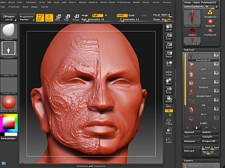建模方面,ZBrush是一个极其高效的建模器。它进行了相当大的优化编码改革,并与一套独特的建模流程相结合,可以让艺术家制作出令人惊讶的复杂模型。无论是从中级还是到高分辨率的模型,艺术家的任何雕刻动作,诸如Move、Stitch、layer、Flatten等,虚拟的三维造型都会瞬间得到回应,其手法与传统雕塑极为相似, 我们可以做挤压、揉捏、平滑等动作。另外,Zbrush拥有独特的A1pha通道贴图造型,这样就可以使三维造型艺术家能够轻松模拟出真实的材质肌理效果,如同雕塑家用专门制作的造型工具来实现作品的纹理特征。另外zBrush强大的模型创建方式还包括了 一种叫做ZSphere的模型结构,通过该工具可以迅速地以球体与球链的组合概括任何形体特征,从而生成网格物体,再经过细分并逐步雕刻,最终可以制作出极致细腻的效果。