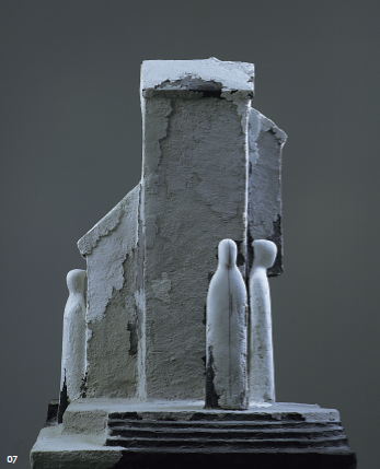 纸墨是中国书法的基本材料,黑白是材料的物质属性所决定的,中国文人利用这些材料的特点,形成了具有中国特色的色彩,表现了中国文人的审美情怀。纸的白色形成了如同雕塑的“负空间”,墨的黑色如同雕塑的形体,墨的黑在色彩上具有消退的感觉,而纸的白具有扩展的感觉,在书法上黑主导画面,白却始终是被动的,白与黑形成了一个对立统一的整体,黑的变化决定了白的形态。我在最近做的雕塑中也采用了黑白两色,但是我对于黑白色彩的运用和书法相反,白成为人物的色彩,黑构成人物的背景,黑是消退的,突出了主体人物的白。
